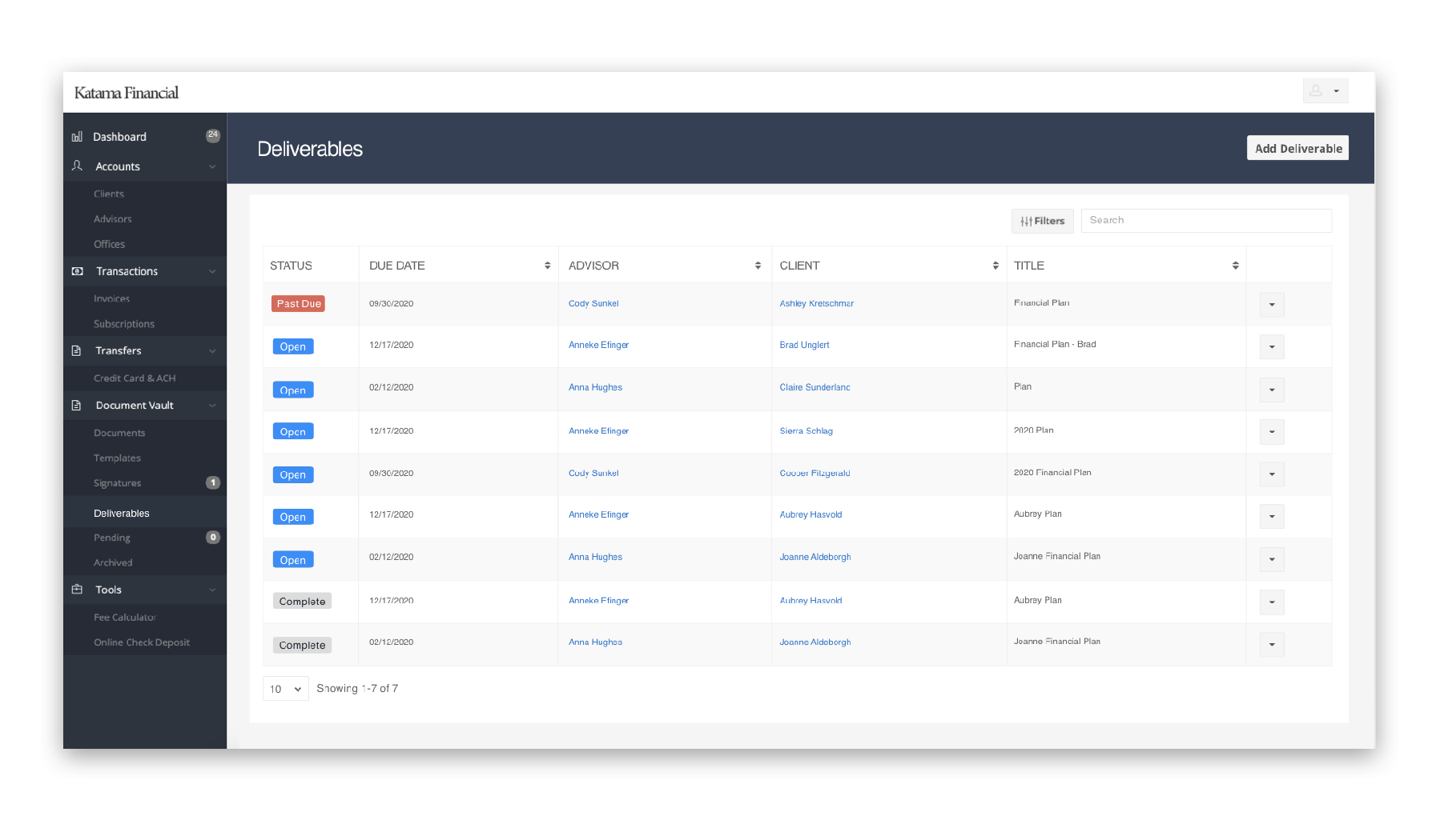 Home Office and Advisors can track Open, Overdue, and Complete deliverables